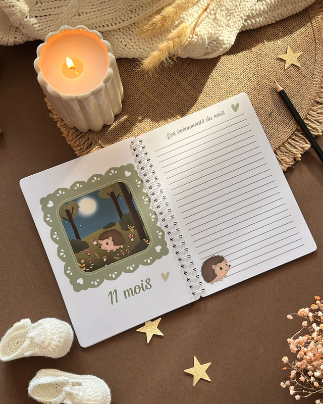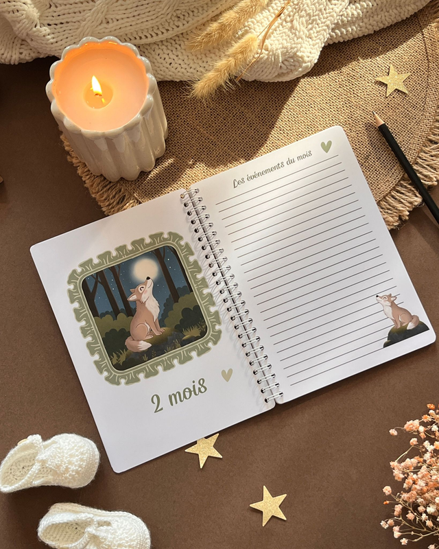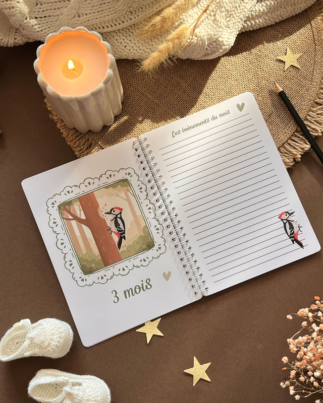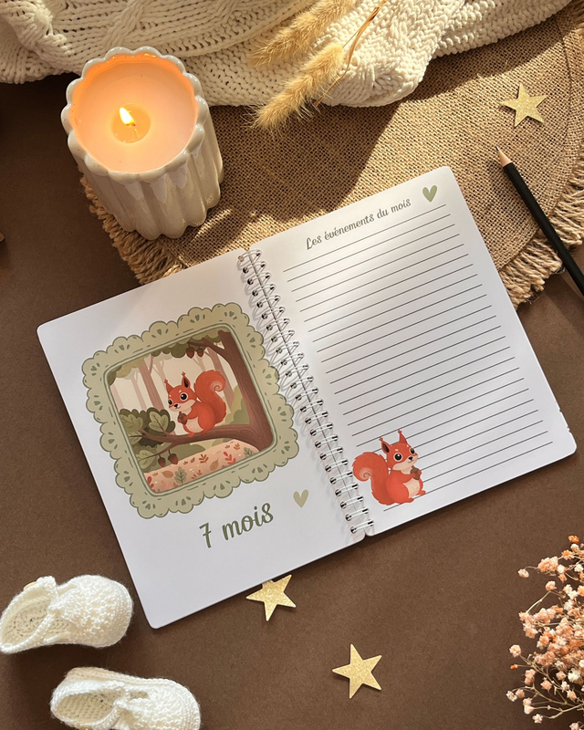 Chaque mois, retrouvez les jolis animaux de la forêt ainsi qu'une page lignée dédiée à vos anecdotes : ses progrès, ses sourires et tous les moments que vous ne voulez jamais oublier. De sa toute première photo au gâteau de ses un an, ce livret devient le gardien de son histoire.