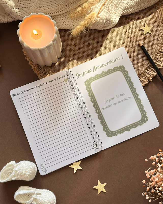 - Structure : 30 pages, pages photos dédiées (naissance & 1 an) + pages lignées mensuelles,
