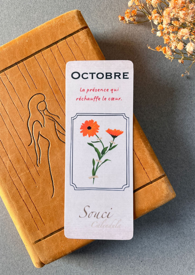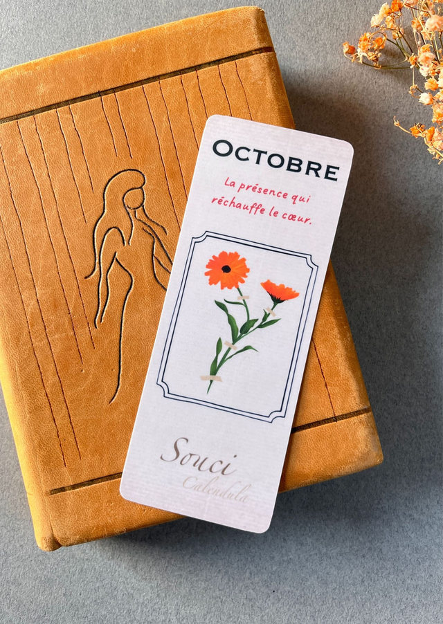 Retrouvez l'ambiance des vieux herbiers de botanistes avec ce marque-pages illustré d'un Souci et qui est dédié aux natifs d'Octobre.