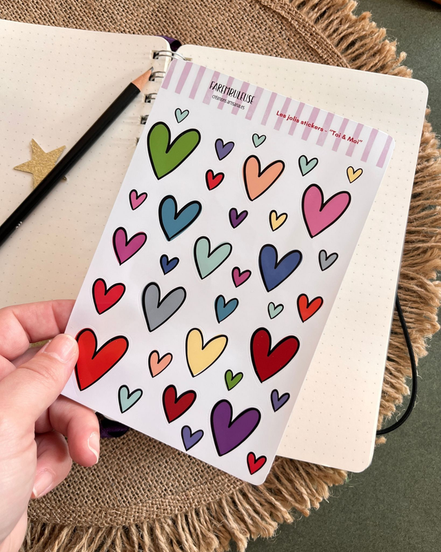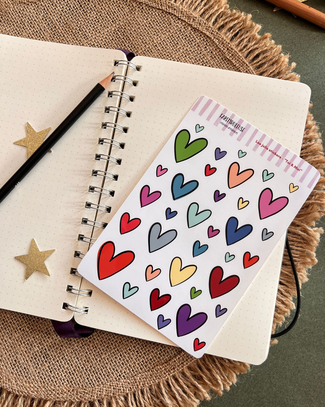En ce qui concerne les visuels, pas de chichis, juste l'essentiel encore une fois : des rayures pour la modernité, un cœur et des mots tendres pour l'amour… Et plein de couleurs, parce que… je n'ai pas su choisir !